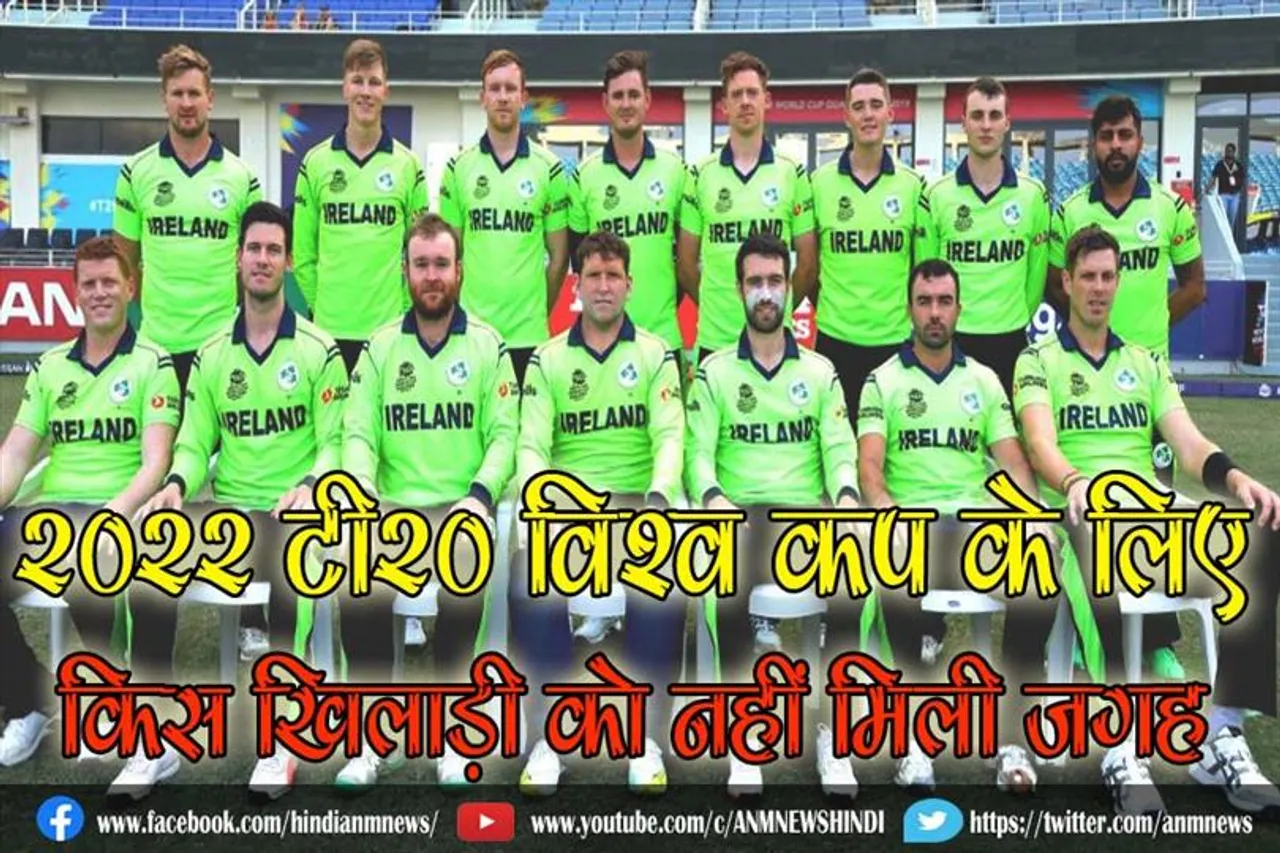 सूत्रों के मुताबिक अगले महीने होने वाले टी20 विश्व कप के लिए आयरलैंड की टीम : ऐंडी बैलबर्नी (कप्तान), पॉल स्टर्लिंग (उपकप्तान), मार्क एडेर, कर्टिस कैंफ़र, गैरेथ डेलेनी, जॉर्ज डॉकरेल, स्टीफ़न डोहेनी, फ़िन हैंड, जॉश लिटिल, बैरी मक्कार्थी, कॉनर ऑलफ़र्ट, सिमी सिंह, हैरी टेक्टर, लॉरकन टकर, क्रेग यंग।