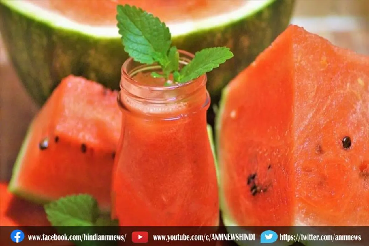 स्टाफ रिपोर्टर, एएनएम न्यूज: समर सीजन में हेल्दी रहने में तरबूज का जूस काफी मददगार होता है। तरबूज का जूस बनाने के लिए सबसे पहले तरबूज के बीज निकालें और फिर उसके टुकड़े काट लें। इसके बाद पुदीना पत्तियां लेकर उन्हें भी बारीक कट कर लें। अब मिक्सर जार में तरबूज के टुकड़े और पुदीना पत्तियां डाल दें। इसके बाद जार में काला नमक और चीनी डालकर ग्राइंड कर लें। जब स्मूद मिश्रण तैयार हो जाए तो मिक्सर बंद कर दें। अब जार का ढक्कन खोलने के बाद उसमें नींबू रस मिक्स कर दें। इसके बाद चम्मच की मदद से नींबू रस को अच्छे से मिलाएं और छन्नी की मदद से एक बर्तन में तैयार किया गया तरबूज का जूस छान लें। इसके बाद सर्विंग गिलास लें और तैयार किया गया जूस उसमें डाल दें। ऊपर से 2-3 आइस क्यूब्स को गिलास में डालें और पुदीना पत्तियों से गार्निश कर दें। तैयार है एनर्जी से भरपूर हेल्दी तरबूज का जूस।